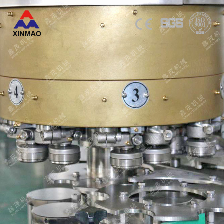 易拉罐含氣飲料灌裝設(shè)備采用等壓灌裝原理,當(dāng)空罐經(jīng)撥輪進入升降托罐盤后,灌裝閥和空罐對中,空罐升起并密封,同時自動打開灌裝閥的閥口,當(dāng)灌裝液面堵住閥的回氣管口時停止灌裝。灌好的罐子經(jīng)鉤子鏈送到封口機頭,蓋子經(jīng)送蓋器及壓頭把蓋子送到罐口上,當(dāng)托罐機構(gòu)升起時,壓頭壓緊罐口,封口輪先預(yù)封再實封,罐子封好后被打蓋機構(gòu)的打頭推出,然后進入出罐輸送。