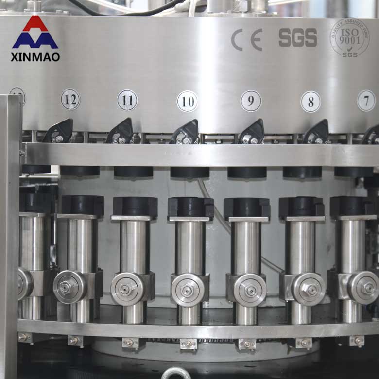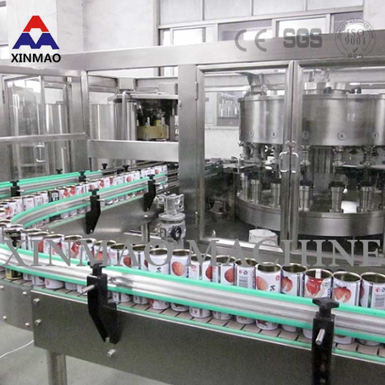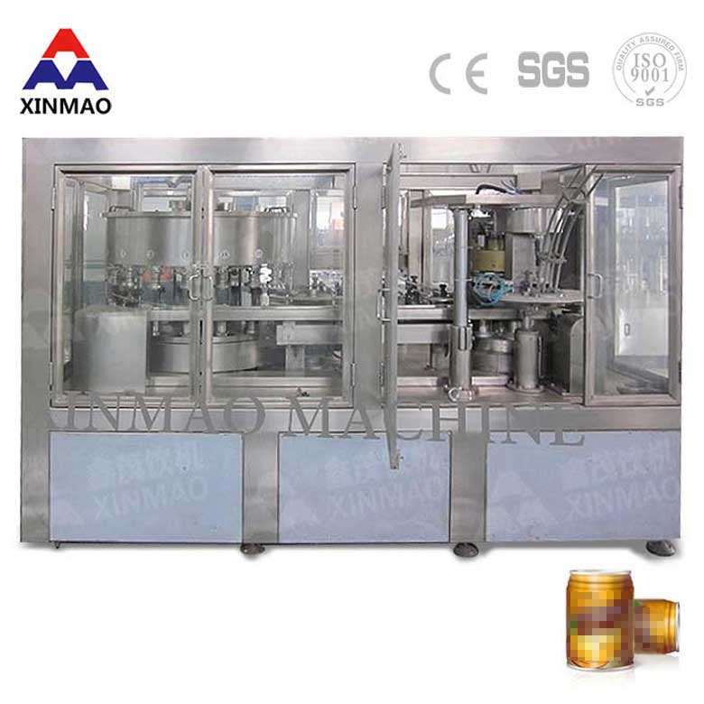 本機(jī)是在消化吸收國內(nèi)外(不含汽)易拉罐灌裝封罐機(jī)(封口機(jī))的基礎(chǔ)上張家港鑫茂開發(fā)的設(shè)備。采用常壓灌裝原理,當(dāng)空罐經(jīng)撥輪進(jìn)入升降托罐盤后,灌裝閥和空罐對中,空罐升起并密封,同時(shí)自動(dòng)打開灌裝閥的閥口,當(dāng)灌裝液面堵住閥的回氣管口時(shí)停止灌裝。灌好的罐子經(jīng)鉤子鏈送到封口機(jī)頭,蓋子經(jīng)送蓋器及壓頭把蓋子送到罐口上,當(dāng)托罐機(jī)構(gòu)升起時(shí),壓頭壓緊罐口,封口輪先預(yù)封再實(shí)封,罐子封好后被打蓋機(jī)構(gòu)的打頭推出,然后進(jìn)入出罐輸送。