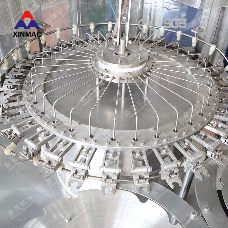 瓶子由通過風(fēng)送道傳遞,然后通過撥瓶星輪傳送至三合一機(jī)的沖瓶機(jī)。沖瓶機(jī)回轉(zhuǎn)盤上裝有瓶夾,瓶夾夾住瓶口沿一導(dǎo)軌翻轉(zhuǎn)180°,使瓶口向下。在沖瓶機(jī)特定區(qū)域,沖瓶夾噴嘴噴出沖瓶水,對瓶子內(nèi)壁進(jìn)行沖洗。瓶子經(jīng)沖洗、瀝干后在瓶夾夾持下沿導(dǎo)軌再翻轉(zhuǎn)180°,使瓶口向上。洗凈后的瓶子通過撥瓶星輪由沖瓶機(jī)導(dǎo)出并傳送至飲用水灌裝機(jī)。